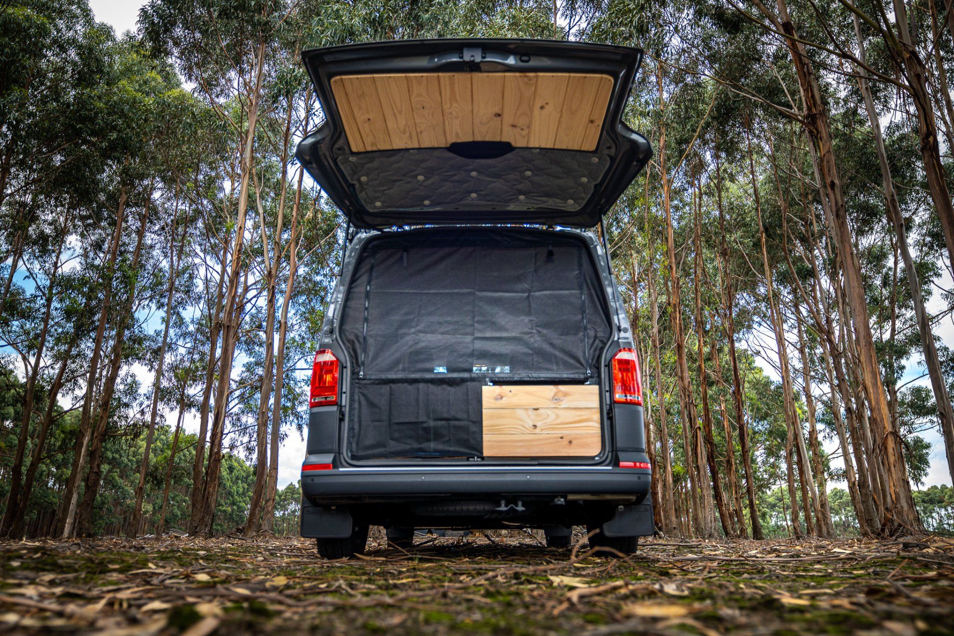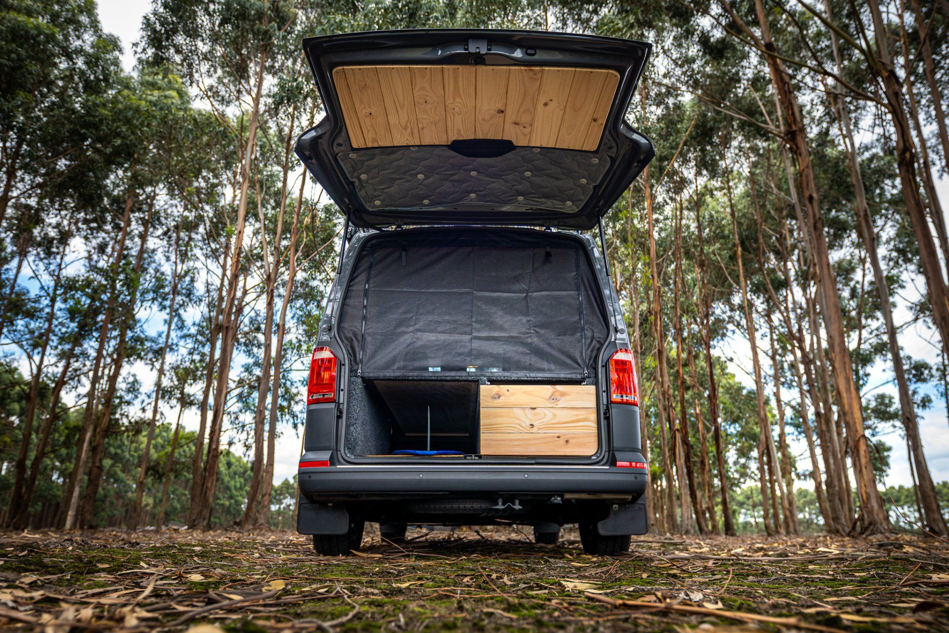 Bringing nature inside with clean light weight pine lined walls, roof and doors. Creating the feel of a cozy wood cabin inside the van.